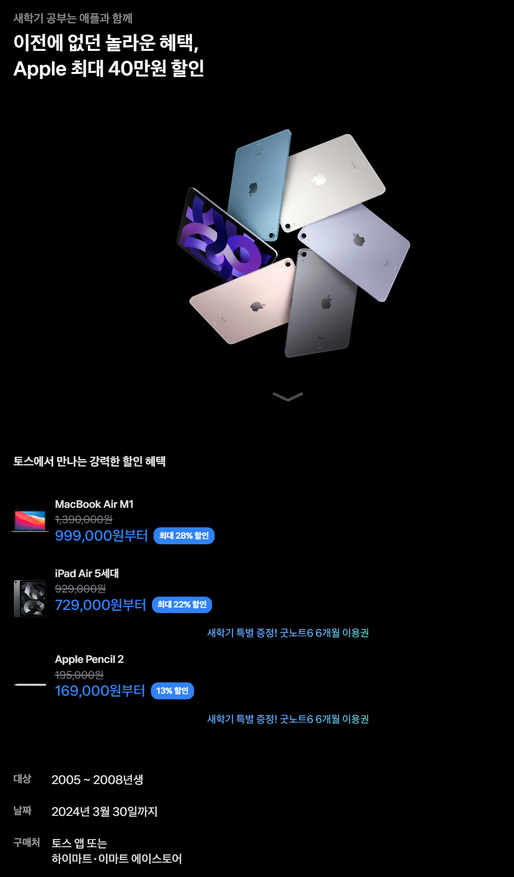 - 2005~2008년생 토스 이용자분께 Apple iPad Air5, MacBook Air(M1), Apple Pencil2 구매 시 할인 혜택을 드리는 이벤트예요.